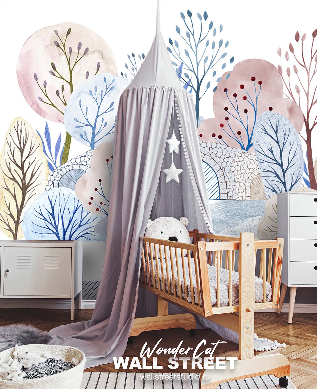 Обои из коллекций Wall Street в трех комнатах: EUPHORIA 22 в гостиной, Zoo в детской комнате, а в спальне Selva