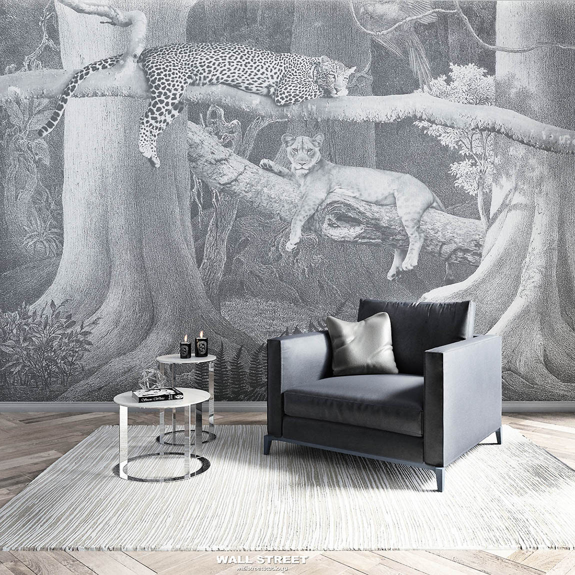 Обои из коллекций Wall Street в трех комнатах: EUPHORIA 22 в гостиной, Zoo в детской комнате, а в спальне Selva