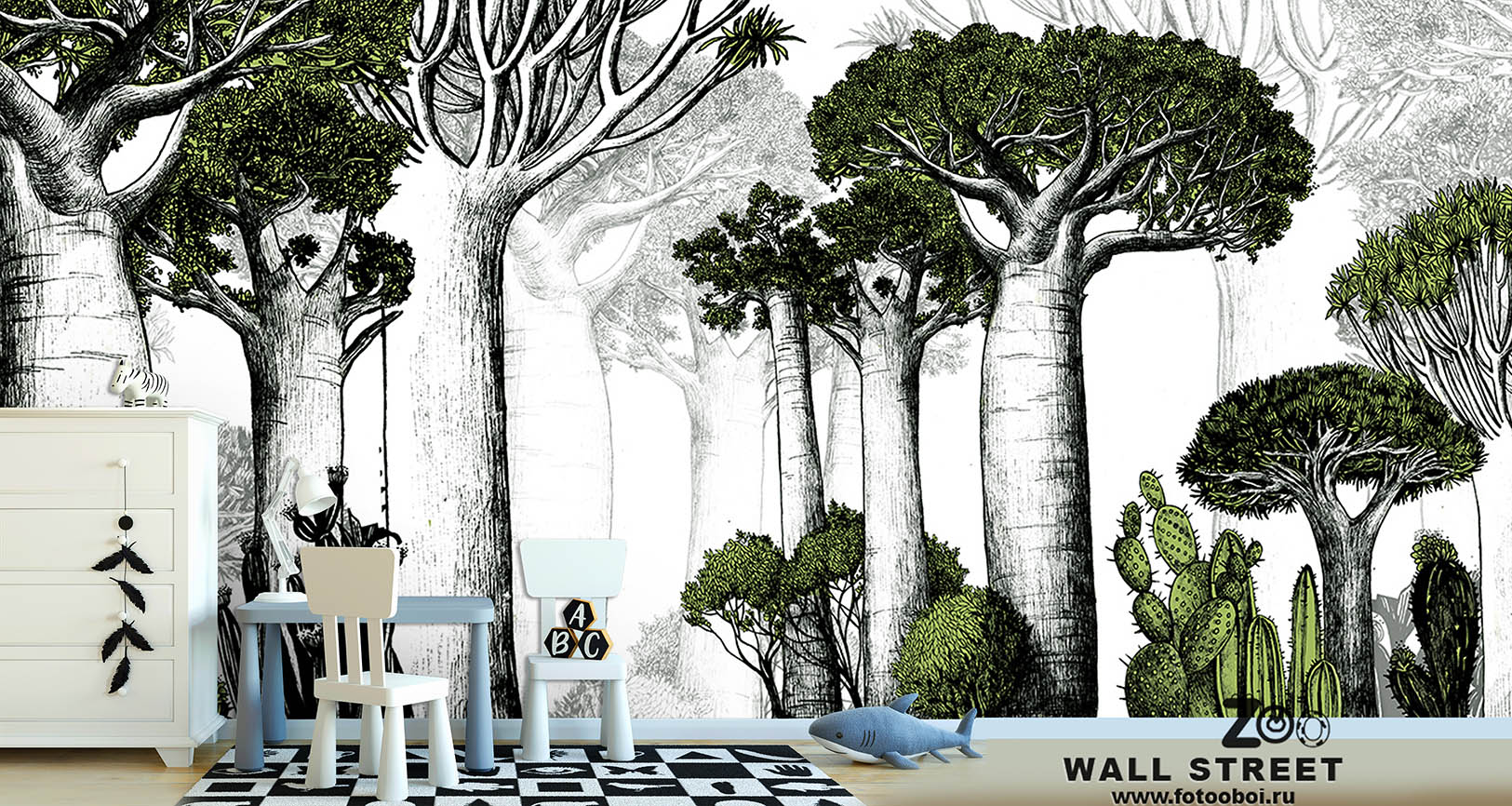 Обои из коллекций Wall Street в трех комнатах: EUPHORIA 22 в гостиной, Zoo в детской комнате, а в спальне Selva